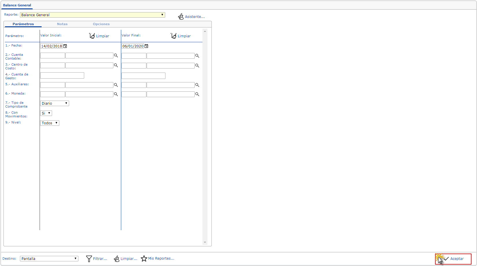 b. Al seleccionar el reporte se nos muestra una tabla de parámetros en la cual podremos establecer cada uno de estos con respecto a lo que queramos emitir en el reporte de "Balance General". Luego de establecer los parámetros deberemos presionar el botón