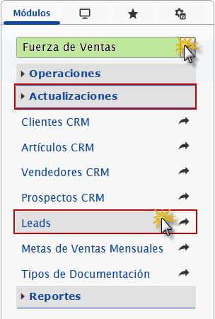 b. En el módulo Fuerza de Ventas, desplegamos el componente Actualizaciones y activamos el sub componente Leads.