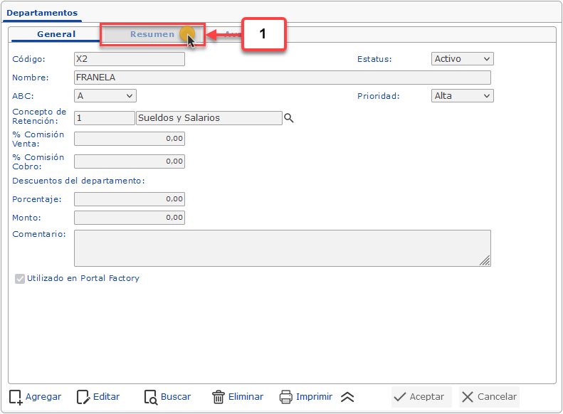 a. Luego de haber seleccionado la opción de Departamentos se muestra la pantalla donde debemos buscar y seleccionar el departamento que deseamos configurar, para esto debemos hacer clic en la pestaña Resumen.