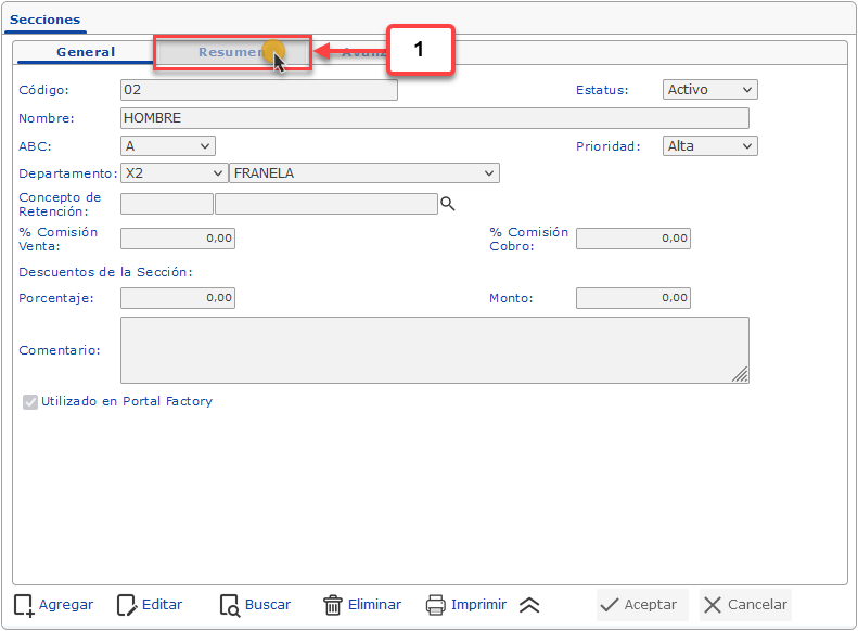 b. Despues de hacer clic en la pestaña Resumen debemos buscar y seleccionar la Sección a la que deseamos configurar el acceso a eFactory Fuerza de Ventas Móviles.