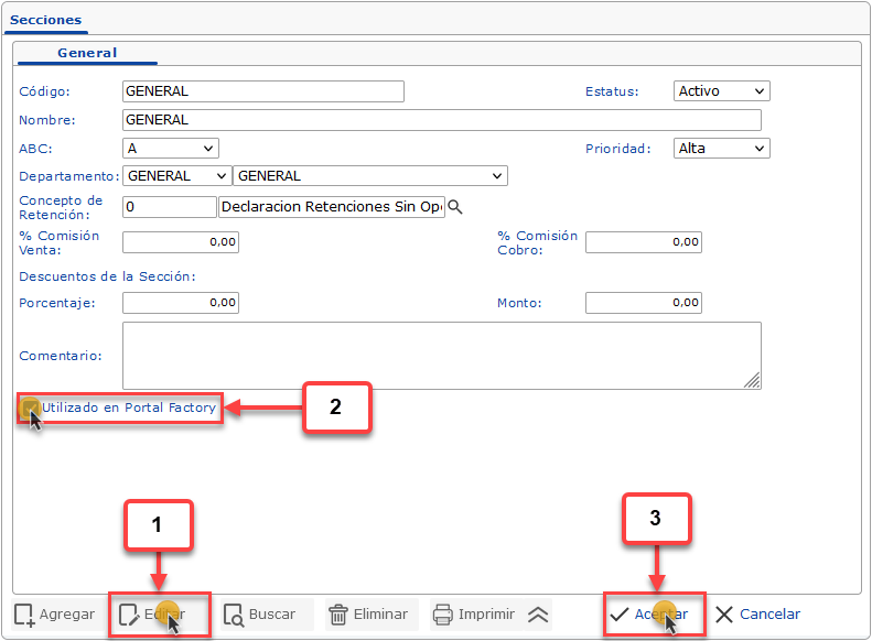 c. Al Seleccionar la Sección que deseamos configurar, debemos hacer clic en el botón