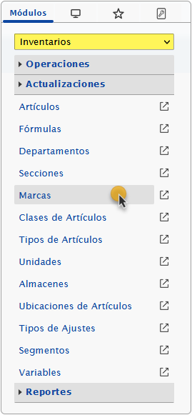 a. Despues de configurar los Secciones podemos configurar las Marcas y para esto debemos seleccionar el módulo Inventarios y al desplegar la sección de Actualizaciones seleccionaremos la opción de Marcas.