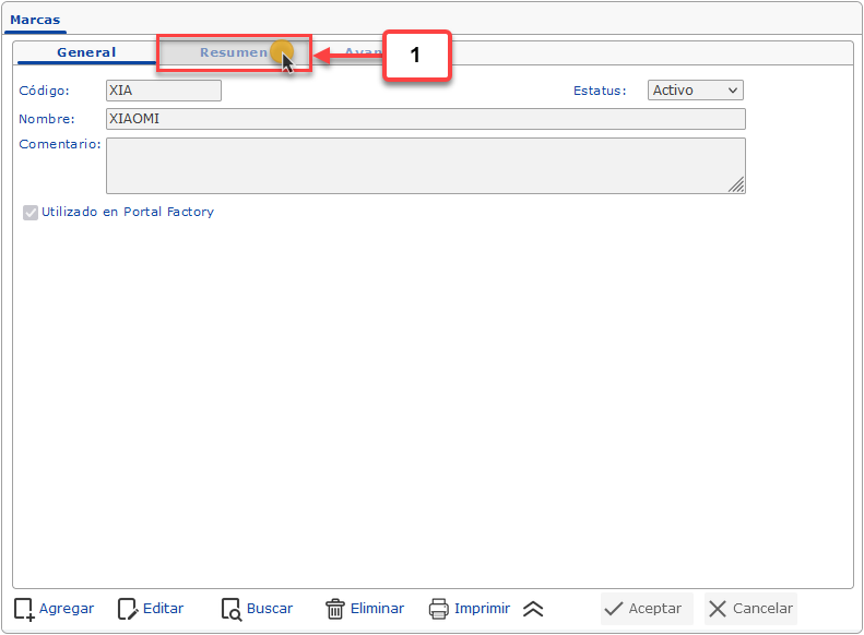 a. Luego de haber seleccionado la opción de Marcas se muestra la pantalla donde debemos buscar y seleccionar la marca que deseamos configurar, para esto debemos hacer clic en la pestaña Resumen.