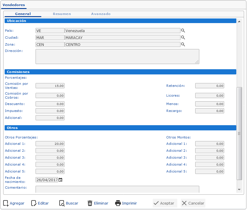 De igual manera contamos con campos extra en la sección Otros, para para definir porcentajes y montos adicionales asociados al Vendedor, Fecha de Nacimiento y Comentario.