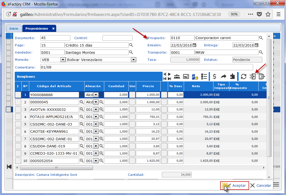 b. Se muestra un formulario con los campos habilitados para crear el documento Proposición, procedemos a ingresar: Prospecto, Pago, Emisión, Entrega, Vendedor, Comentario, entre otros.