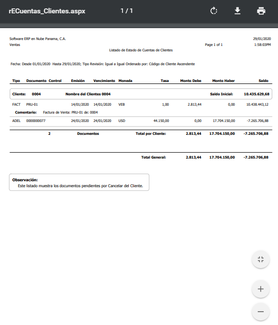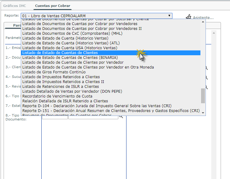 Listado de Estado de Cuentas de Clientes, especificamos los parámetros necesarios y presionamos el botón