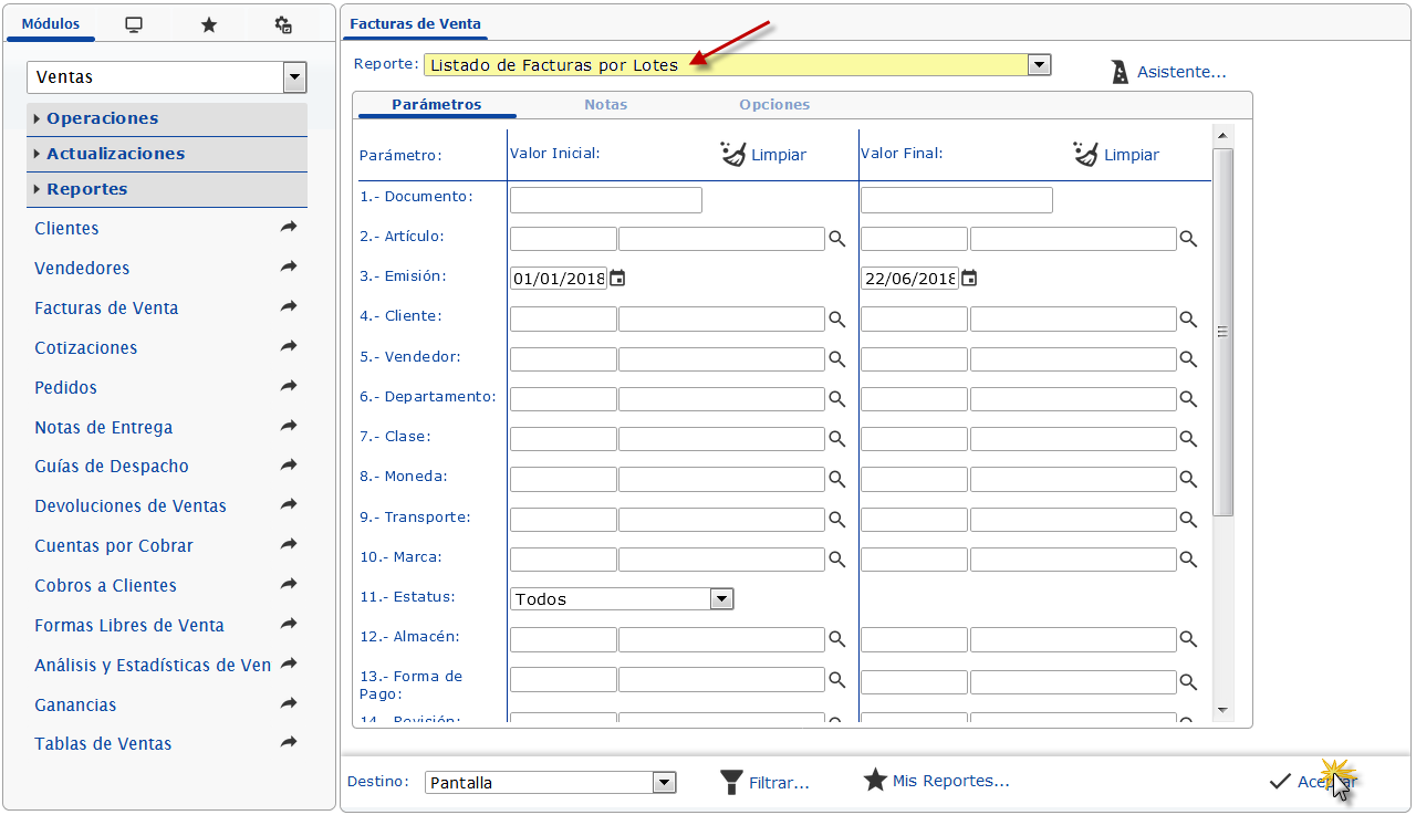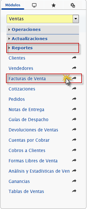 b. En el módulo Ventas, desplegamos el componente Reportes, activamos el sub componente Facturas de Venta