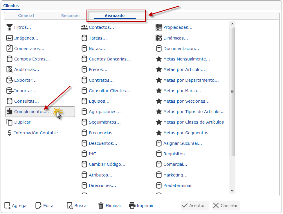 a. En la Ventana Clientes, ficha Avanzado, presionamos el ícono Complementos.