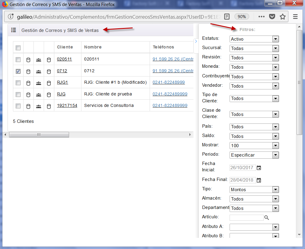 a. Veremos el complemento Gestión de Correos y SMS de Ventas: En la parte central de la pantalla se muestra una lista con información de los Clientes, números telefónicos y demás información de interés.