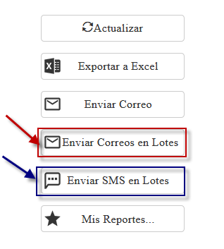 a. Después de haber ajustado los Filtros, seleccionamos aquellos Clientes que recibirán el comunicado y activamos los botones de acción, los cuales se ubican debajo del área de Parámetros, para lo cual usamos la barra de desplazamiento vertical; tenemos dos opciones para envío masivo: Enviar Correos en Lotes y Enviar SMS en Lotes.
