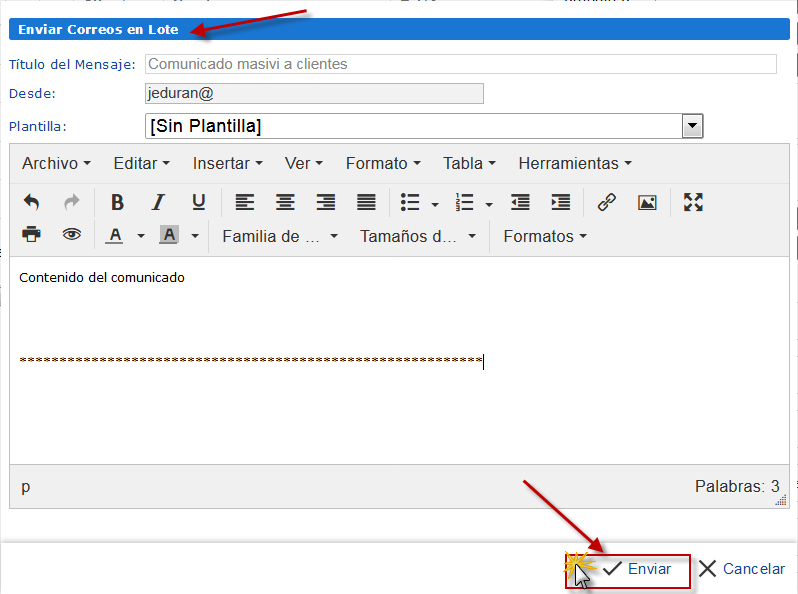 b. Si seleccionamos la opción Enviar Correos en Lotes, debemos indicar el título y el contenido del correo, entre otras especificaciones como Plantilla y Datos Adjuntos; se realizará el envío a los clientes seleccionados en el paso anterior.