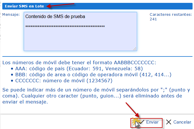 c. Si seleccionamos la opción Enviar SMS en Lotes, debemos indicar el contenido del mensaje de texto; se realizará el envío a los clientes seleccionados en el paso anterior.