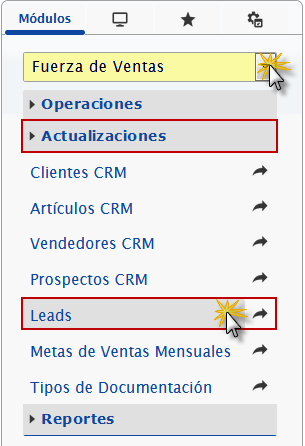b. En el módulo Fuerza de Ventas, desplegamos el componente Actualizaciones y activamos el sub componente Leads.