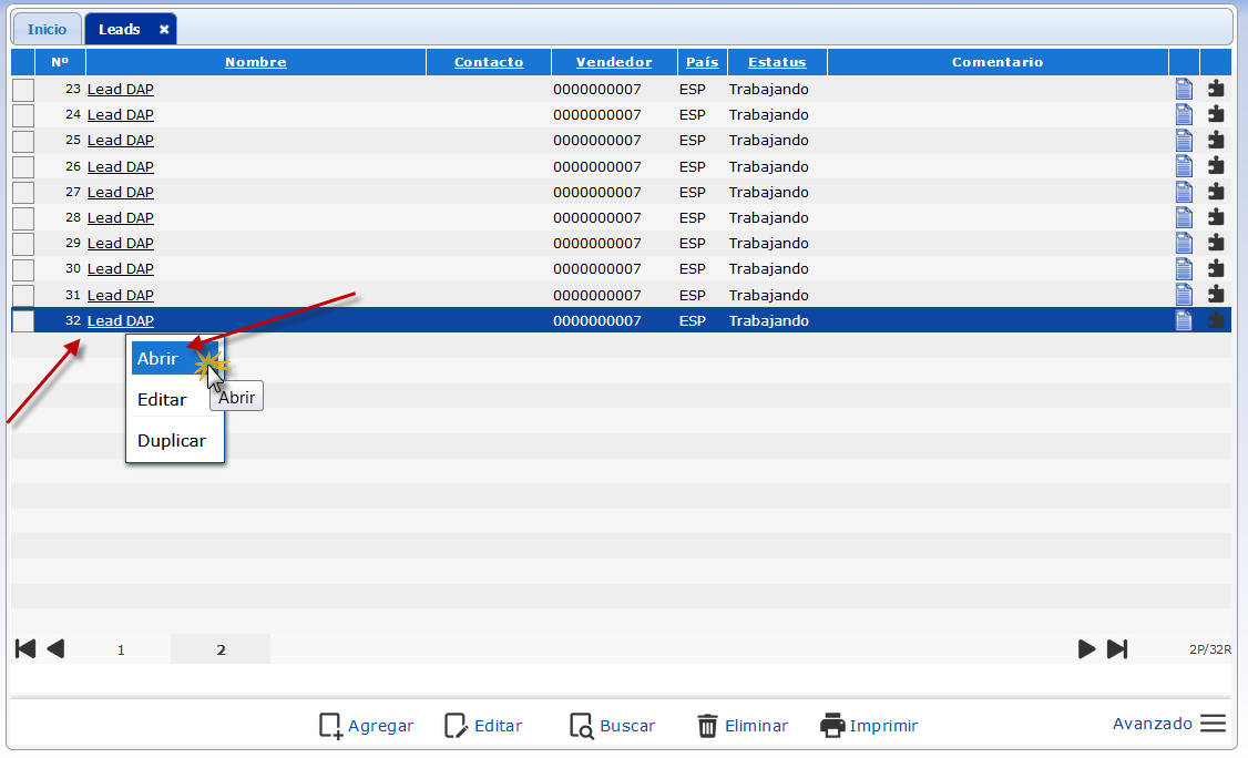 a. Se muestra la ventana Leads, aquí vemos una lista con los Leads ya registrados, ubicamos aquel sobre el cual queremos imprimir el Formato, hacemos clic sobre su Nombre y seleccionamos en el menú contextual, el item Abrir.