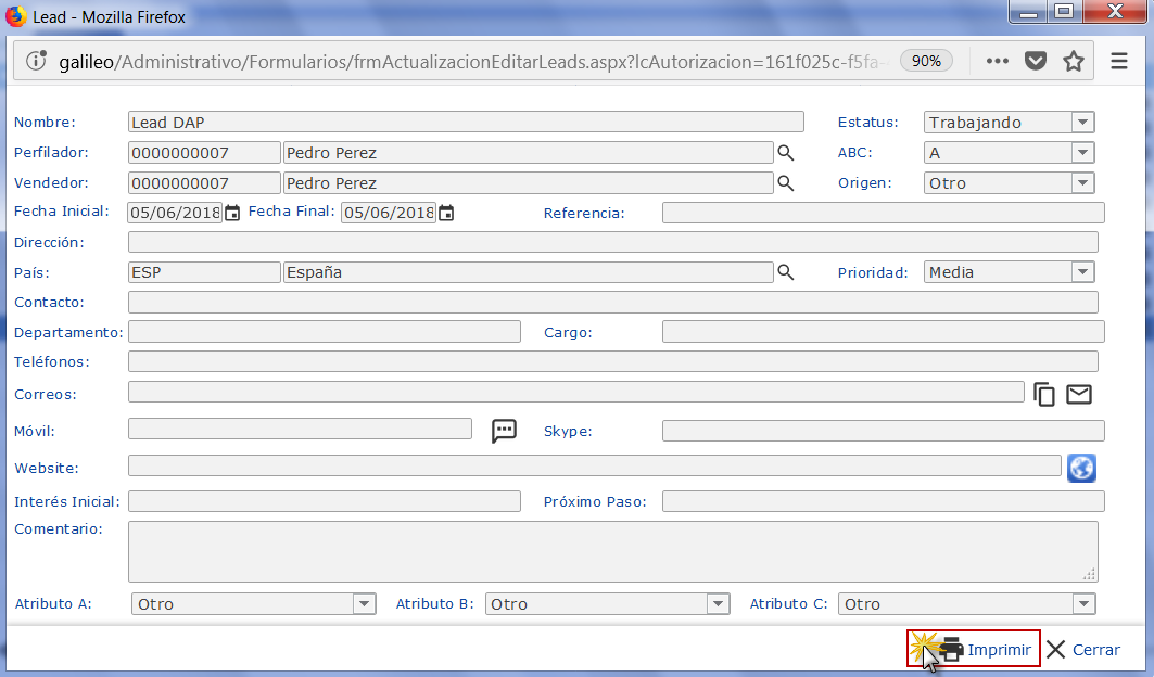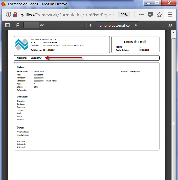 c. Se muestra en pantalla, una vista del Formato de Leads, en la cual podemos detallar los datos de su respectivo registro; procedemos entonces a guardar el documento como archivo pdf o bien a imprimirlo.