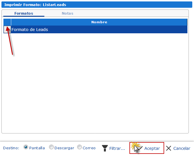 c. En el cuadro que se muestra seleccionamos la opción Formato de Leads y presionamos el botón
