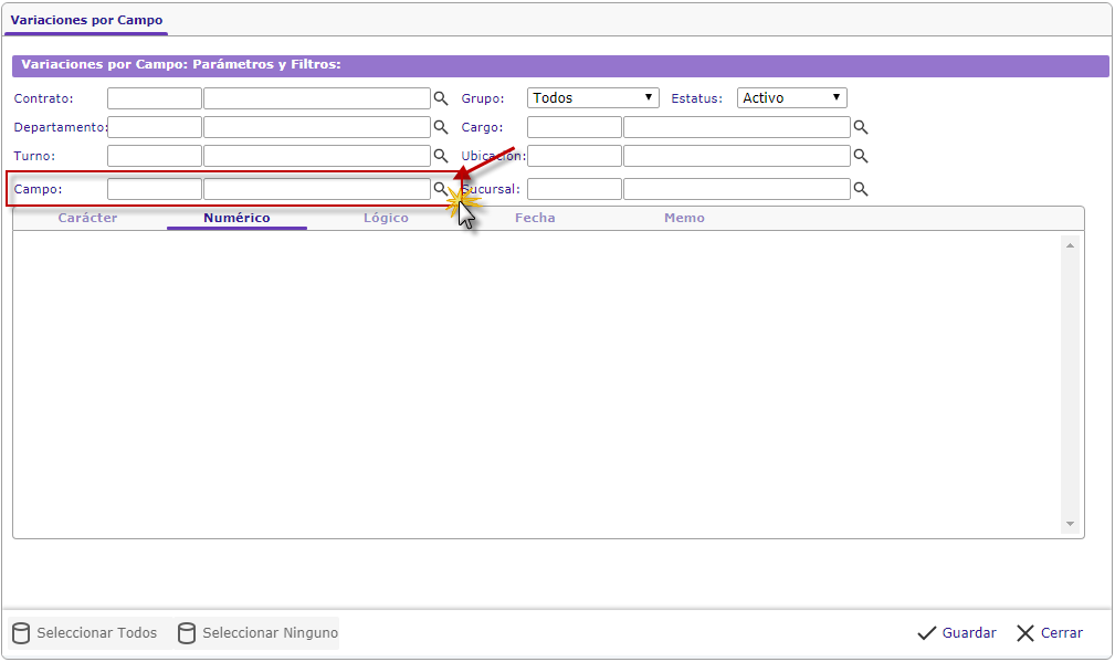 a. Luego se nos desplegara el formulario Variaciones por Campo: Parámetros y Filtros, donde obtenemos los siguentes campos: Contrato, Grupo, Estatus, Departamento, Cargo, Turno, Ubicación, Sucursal y Campo.