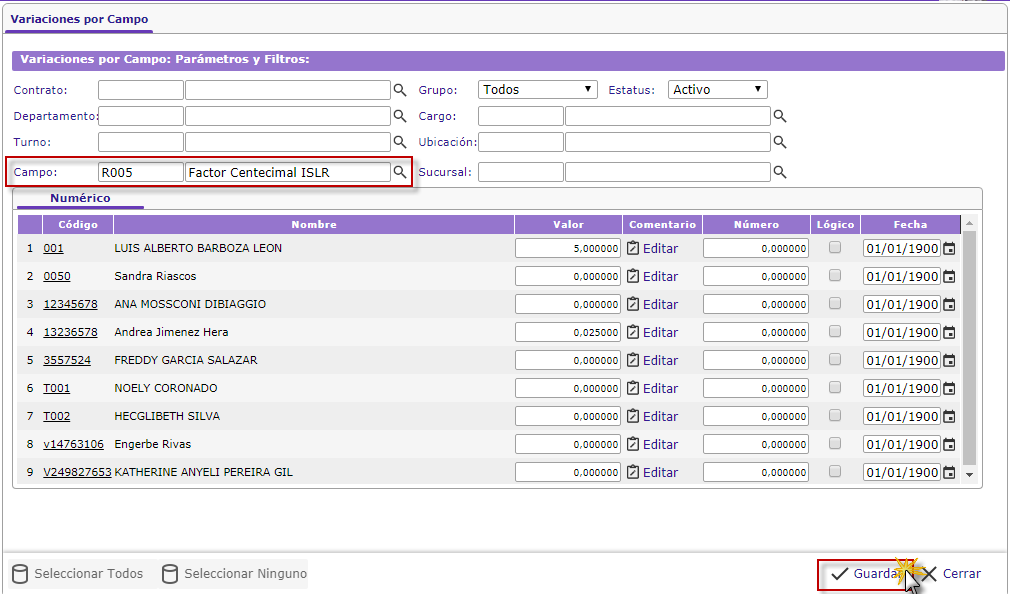 Valor para asignarle el porcentaje de retención a cada trabajador y presionaremos el botón