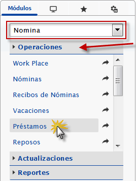 b. En el módulo Nómina, desplegamos el componente Operaciones y activamos el sub componente Préstamos.