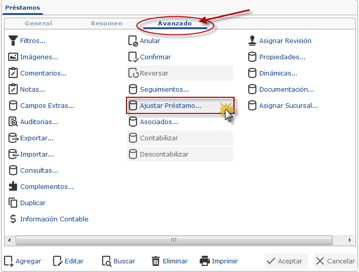 a. En la ventana Préstamos, ficha Avanzado, presionamos el ícono Ajustar Préstamos de Nóminas, para acceder a los préstamos de un trabajador en el formulario.