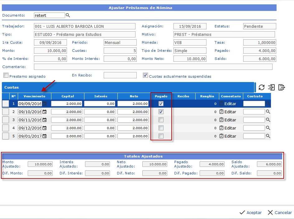 b. Luego de esto se nos desplegara el formulario Ajustar Préstamos de Nóminas donde tenemos los siguientes campos: