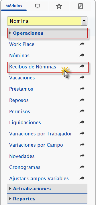 b. En el módulo Nómina, desplegamos el componente Operaciones y activamos el sub componente Recibos de Nóminas.