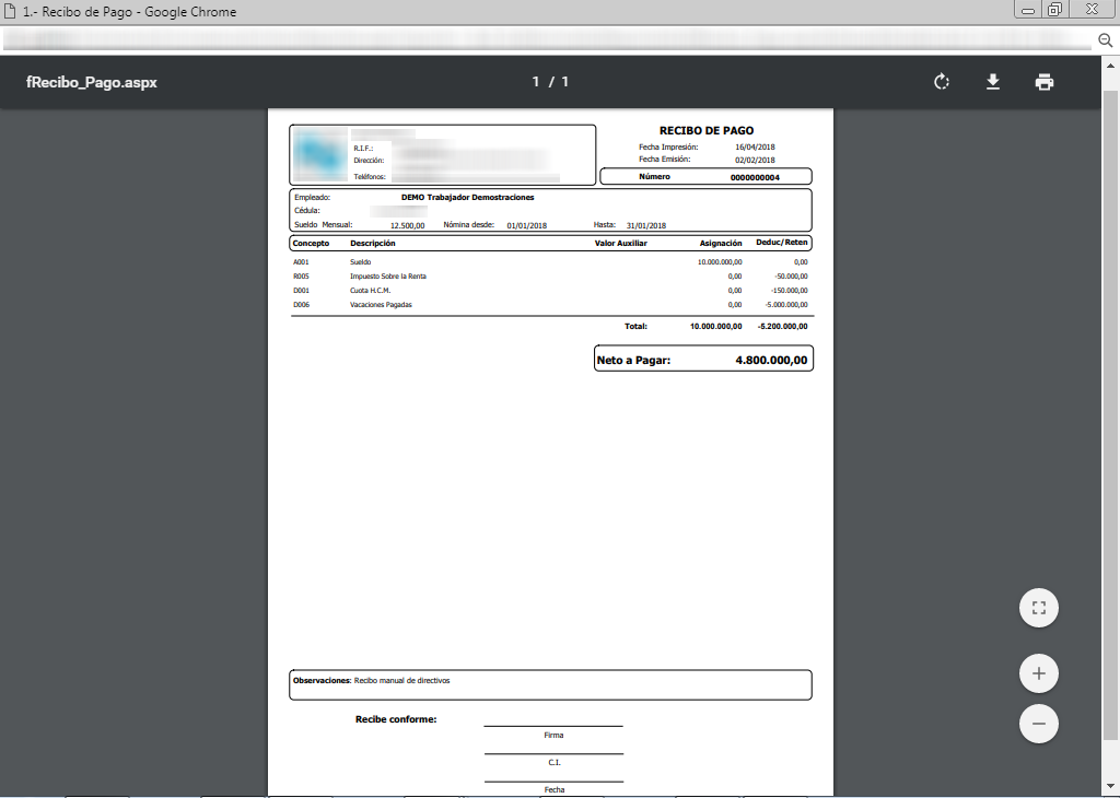 c. Verificamos la información mostrada en el Recibo de Pago y procedemos a su emisión vía correo o impreso.