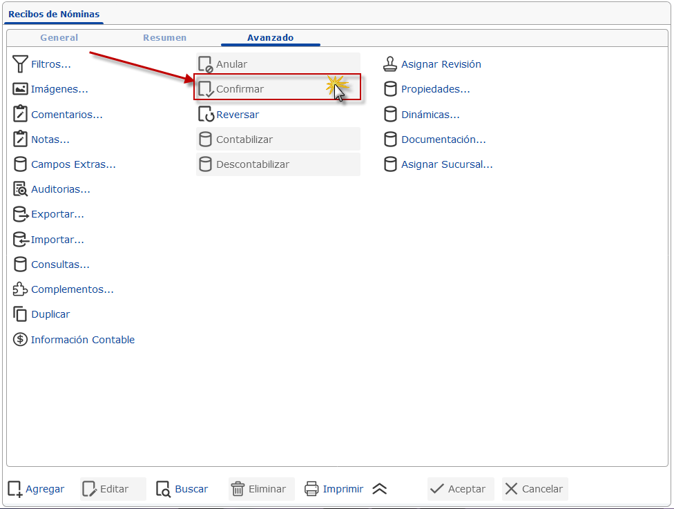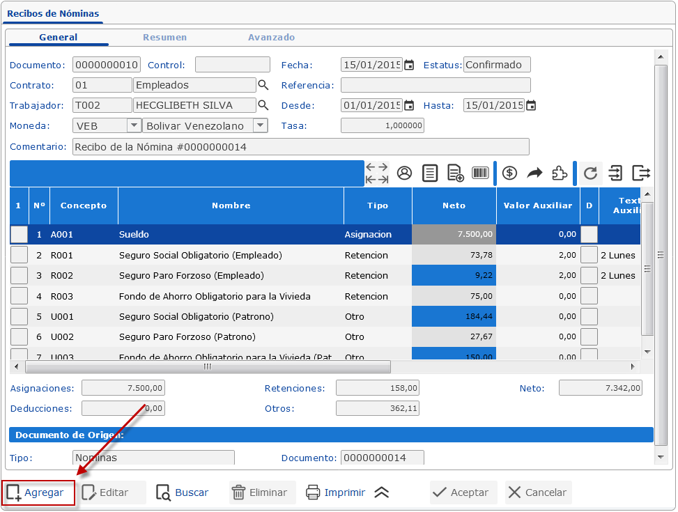 Nómina y presionamos el botón