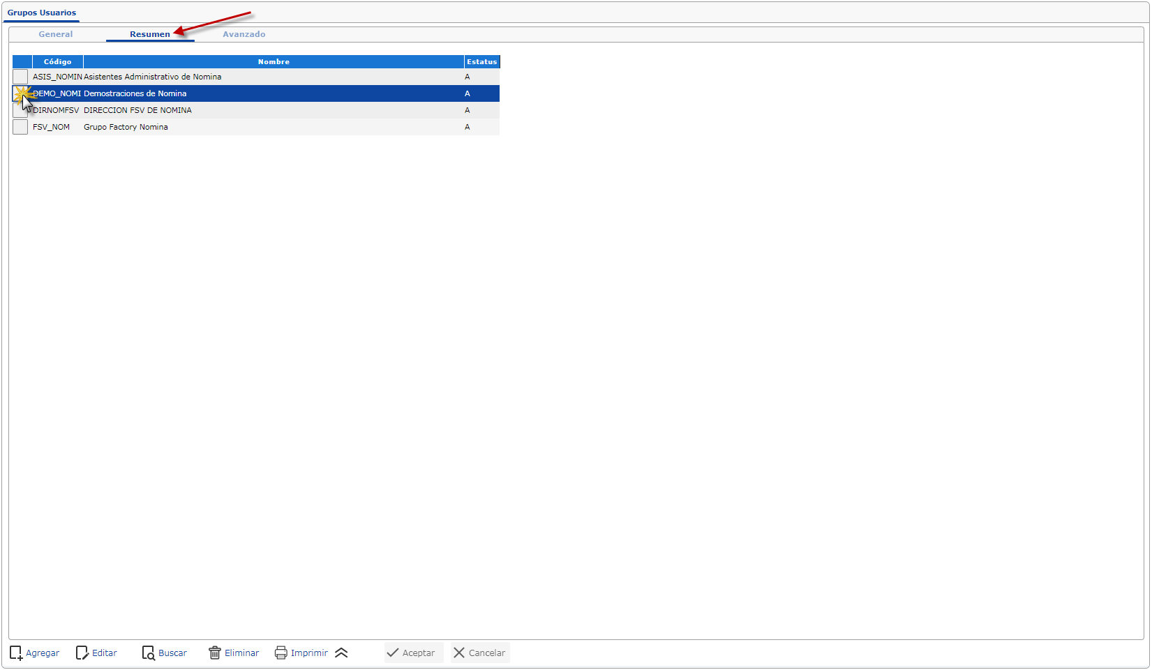 a. Para dar acceso al usuario a un grupo tenemos que ubicarnos en el menú y seleccionar el módulo de Sistema, desplegamos el componete Actualizaciones y activamos el maestro de Grupos Usuarios; Al seleccionar el maestro observamos su ventana donde seleccionaremos la ficha Resumen y buscamo el grupo al que le daremos permiso al usuario global.