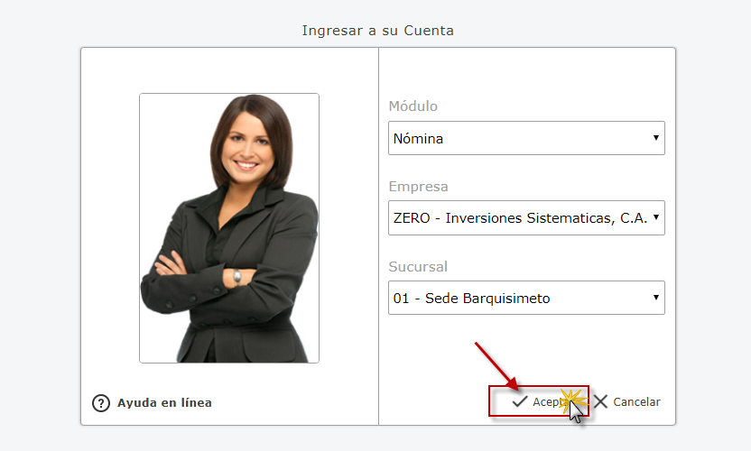 a. Debemos iniciar en el sistema de nómina. en esta pantalla deberemos ingresar con nuestro Usuario y Clave y seleccionaremos el sistema "Nómina", luego de esto presionaremos