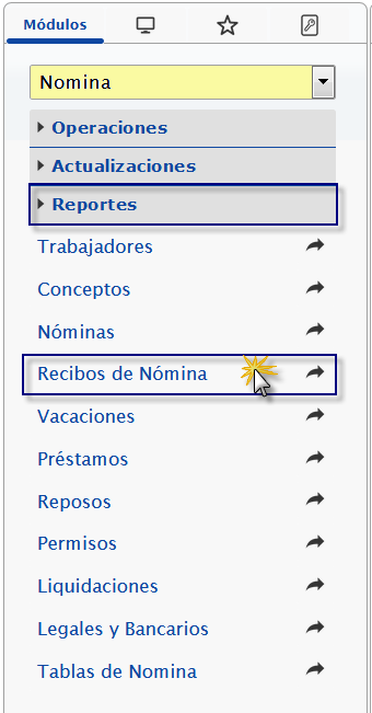 b. En el módulo Nómina, desplegamos el componente Reportes y activamos el sub componente Recibos de Nómina