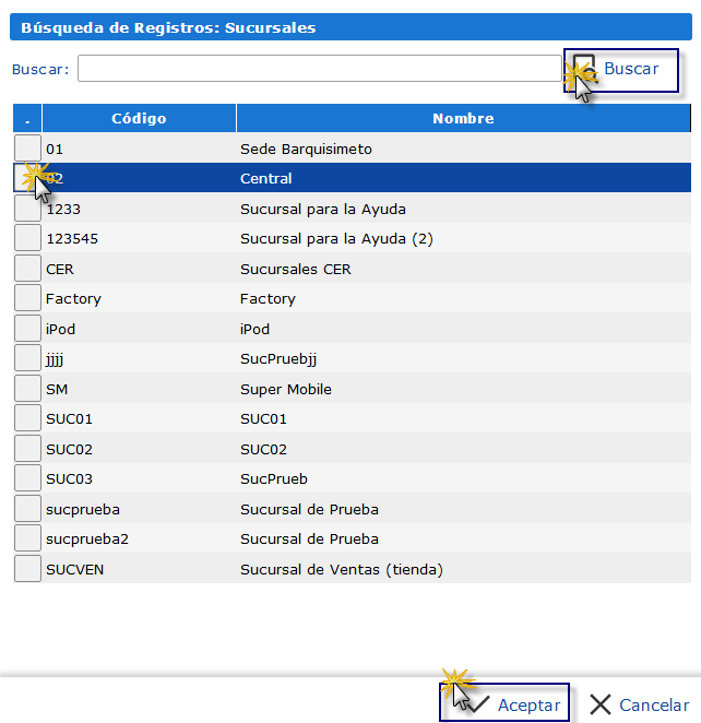 En la ficha Parámetros, podemos escribir los códigos correspondientes cada campo o también presionar el ícono de lupa ubicado a la derecha de estos.