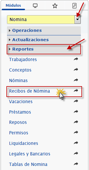 b. En el módulo Nómina, desplegamos el componente Reportes y activamos el sub componente Recibos de Nómina