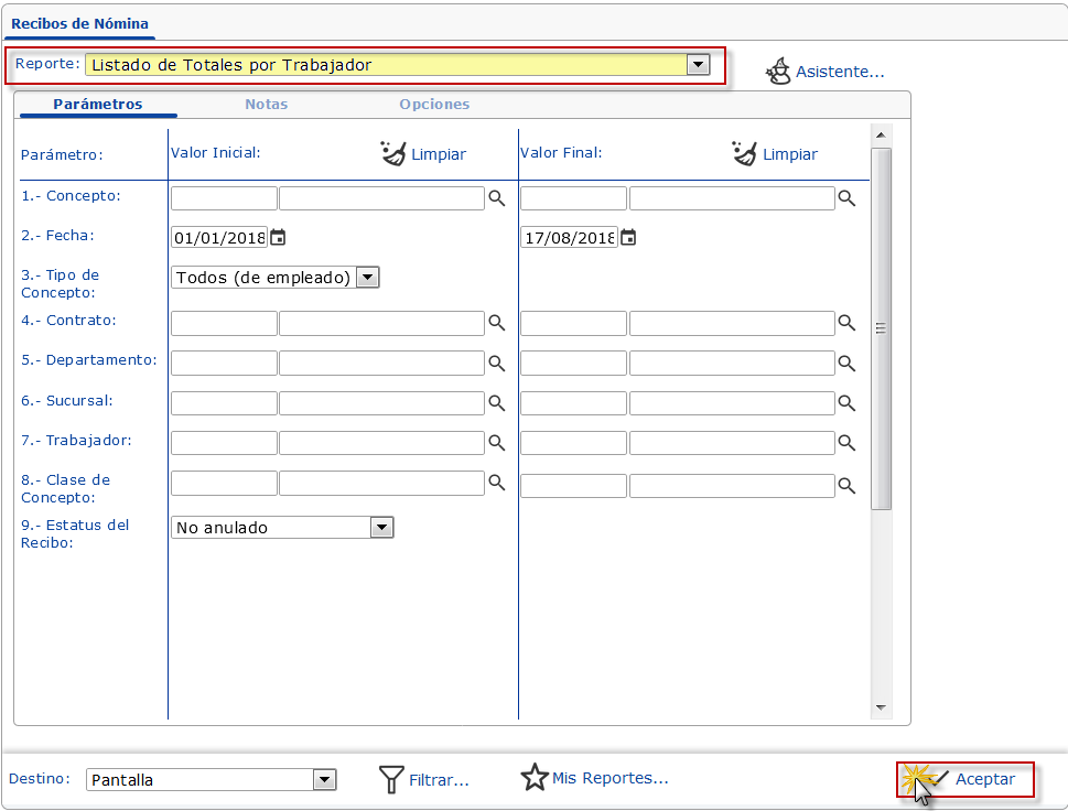 Listado de Totales por Trabajador, especificamos los Parámetros necesarios, entre estos: intervalo de Fecha, Concepto, Contrato, Sucursal, entre otros.