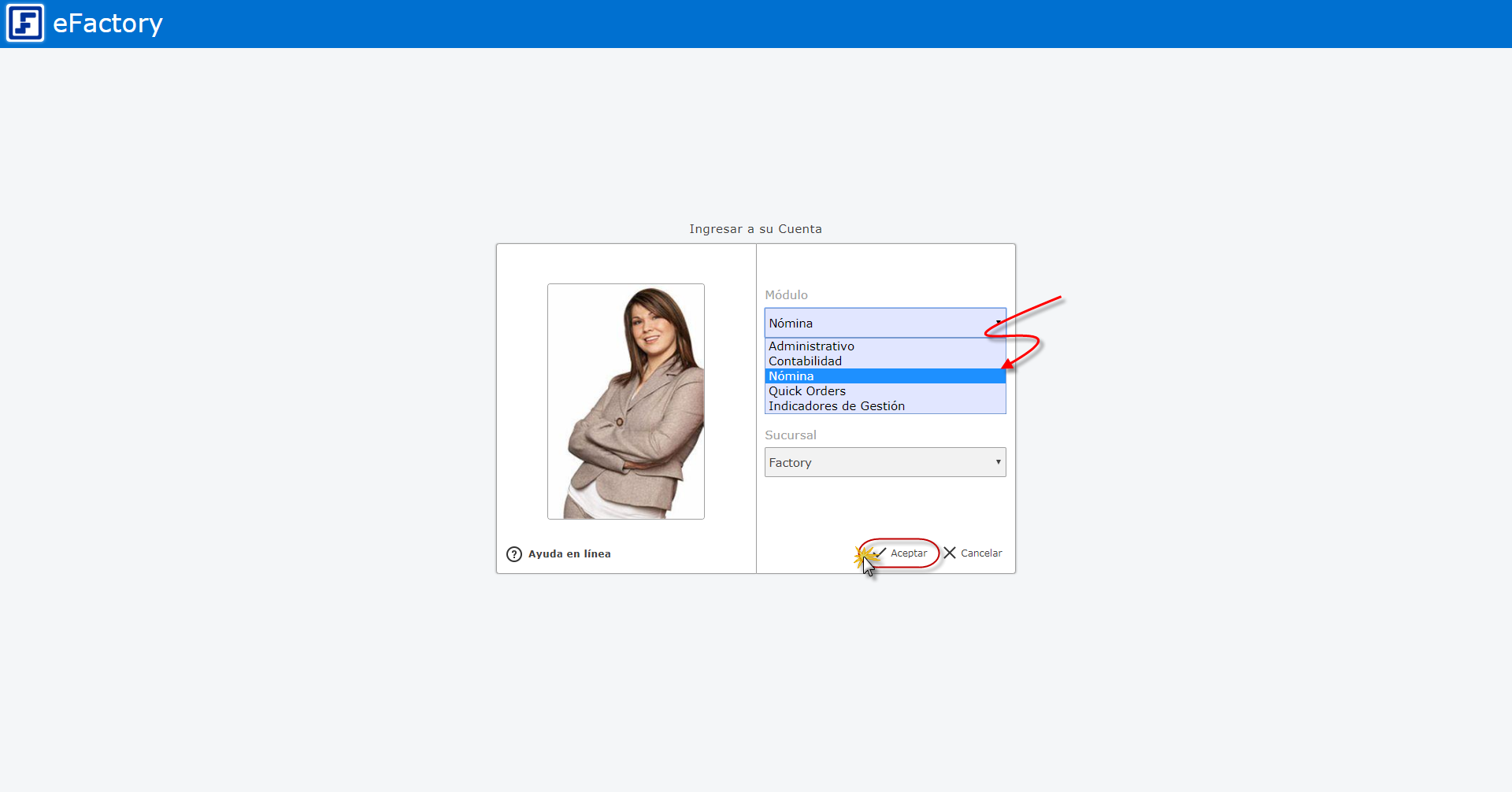 a. Para ingresar debemos iniciar en eFactory con nuestro Usuario, Contraseña, y seleccionaremos el botón