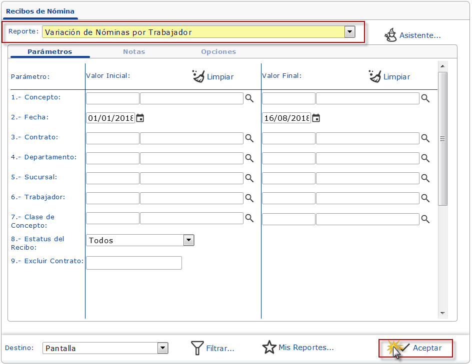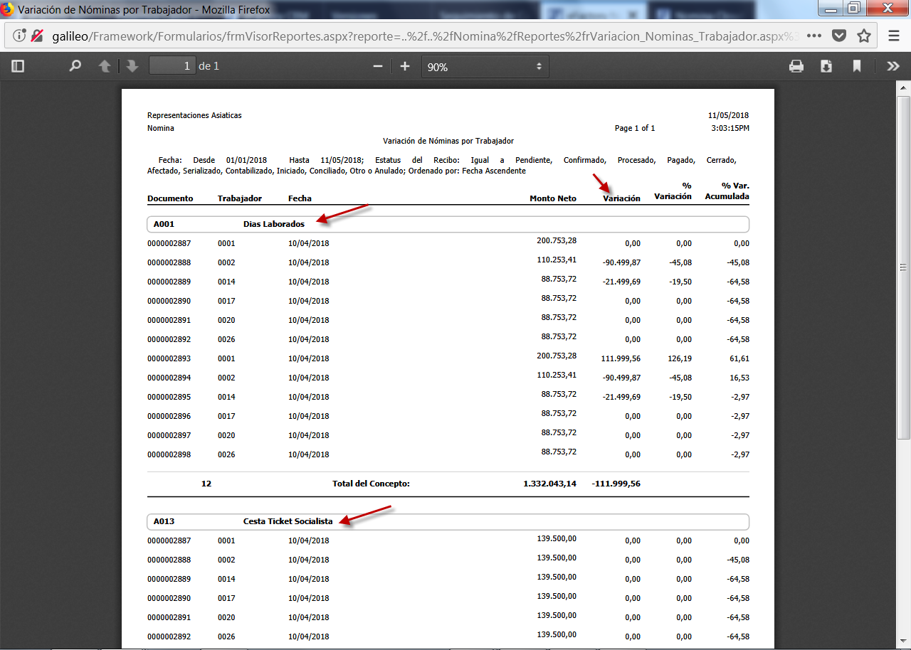 Variación de Nóminas por Trabajador, especificamos los Parámetros necesarios, entre estos: Fecha (periodo para generar reporte), Contrato, Departamento, Sucursal, Trabajador (o rango de Trabajadores), entre otros.