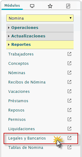 b. En el módulo Nómina, desplegamos el componente Reportes y activamos el sub componente Legales y Bancarios.