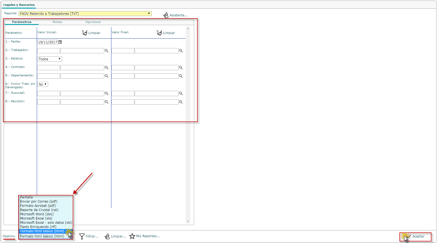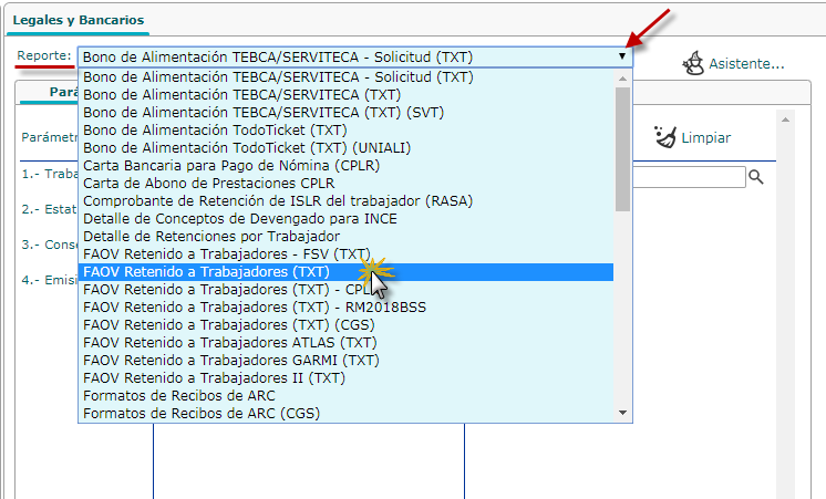 a. Al seleccionar el sub componentes Legales y Bancarios se nos muestra la pantalla correspondiente, donde desplegamos la lista en reportes y seleccionaremos el reportes FAOV Retenido a Trabajadores (TXT).