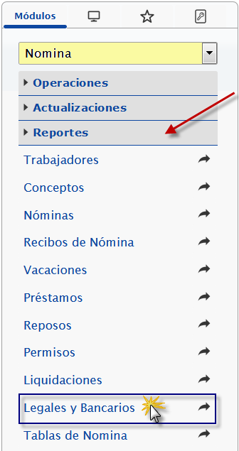 b. En el módulo Nómina, desplegamos el componente Reportes y activamos el sub componente Legales y Bancarios