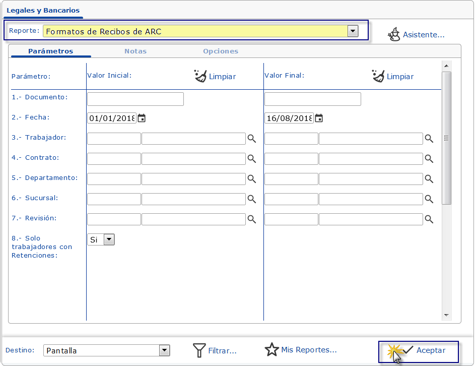 Formatos de Recibos de ARC, especificamos los Parámetros necesarios, entre estos: Fecha (periodo para generar planilla), Contrato, Departamento, Sucursal, Trabajador (o rango de Trabajadores), entre otros.