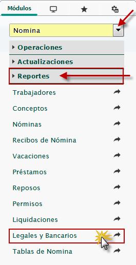 b. En el módulo Nómina, desplegamos el componente Reportes y activamos el sub componente Legales y Bancarios.