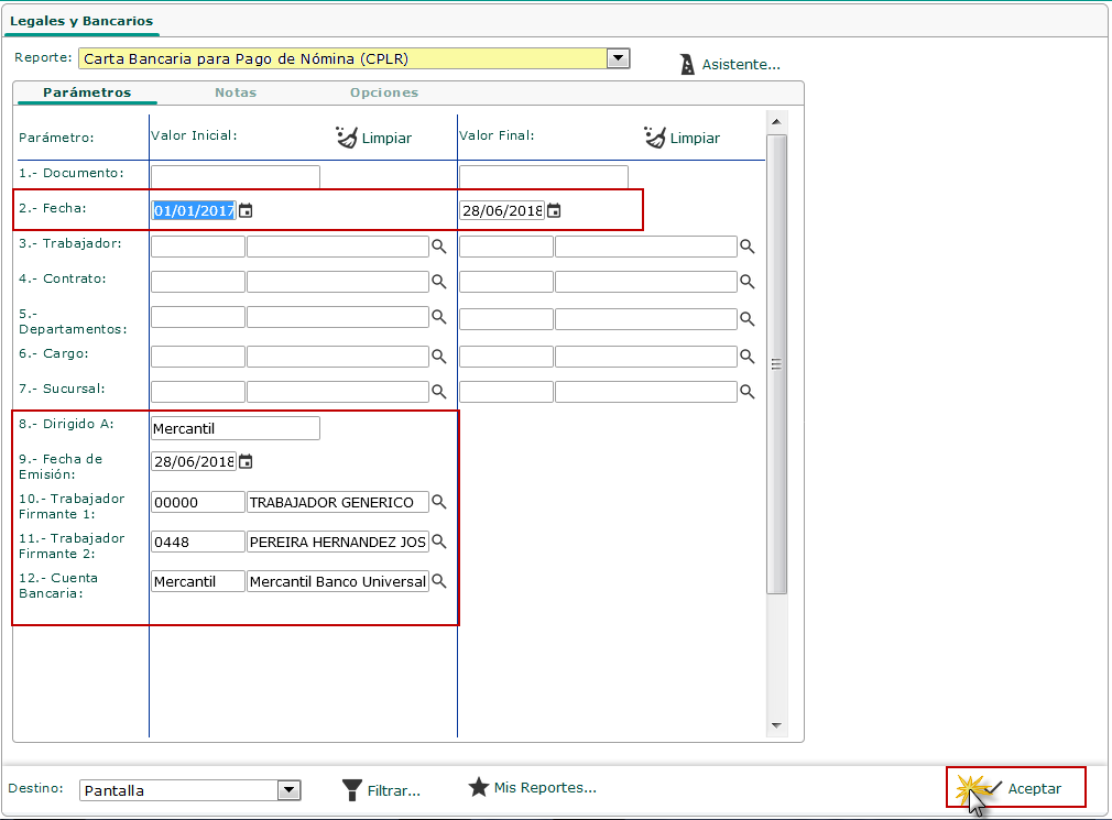 donde deberemos llenar los siguientes filtro: Dirigido A, Fecha, Fecha de Emisión, Usuario Firmante 1, Usuario Firmante 2 y Cuenta Bancaria y luego procedemos a presionar el botón