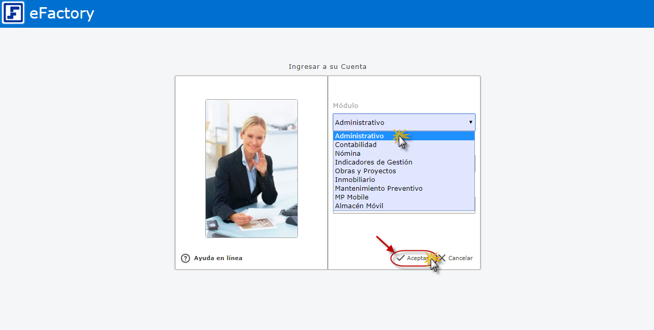 a. Para iniciar en eFactory tenemos que ingresar con nuestro Usuario y Contraseña y seleccionar el botón