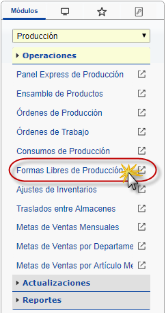 a. Al haber ingresado a eFactory debemos desplegar la lista y seleccionar el módulo Producción, también desplegamos el componente Operaciones y activamos el sub. componente Formas Libres de Producción.