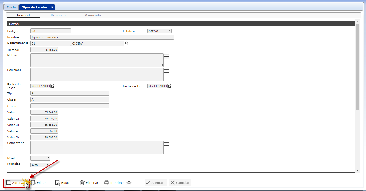 se muestra el formulario de Tipos de Paradas donde procedemos a llenar los campos de formulario.
