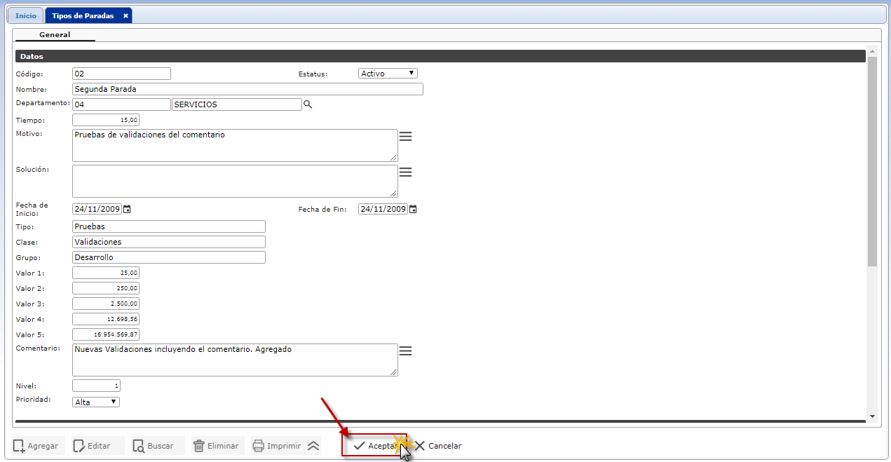c. Luego de haber completado el formulario de Tipos de Paradas presionaremos el botón