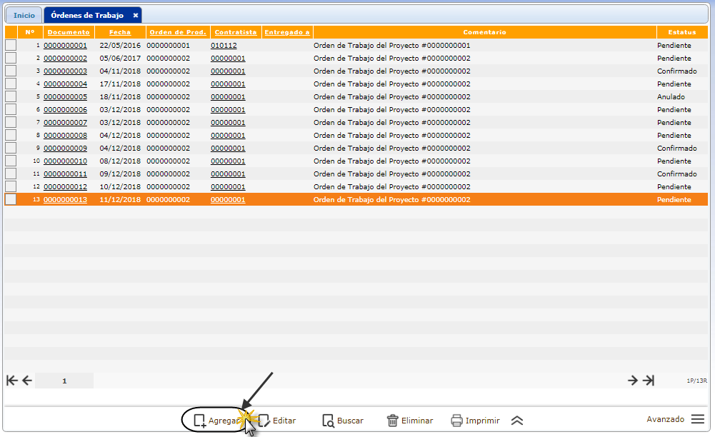 Las órdenes de trabajo son documentos que describen el trabajo que debe realizarse para completar la producción de algún artículo. Mediante esta opción es posible cargar órdenes de trabajo, además de buscar, modificar o eliminar registros previamentes cargados (la modificación o eliminación de una órden de trabajo es posible sólo si el estatus del documento es 'Pendiente'). La pantalla principal de Órdenes de Trabajo permite apreciar de manera rápida el contenido de las órdenes de trabajo registradas, al presionar el campo 'Documento', de igual forma puedes ver los datos de la contratista asociada al proyecto al presionar el campo 'Contratista' del renglón deseado.