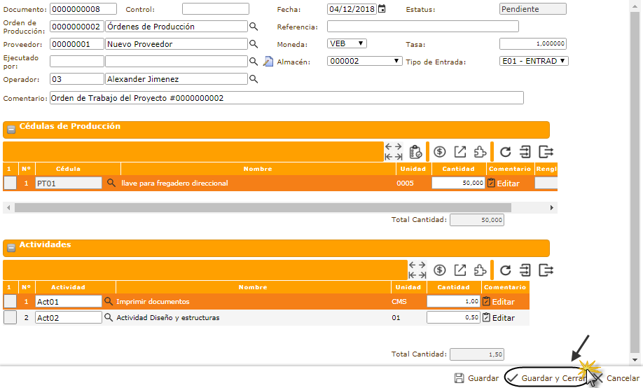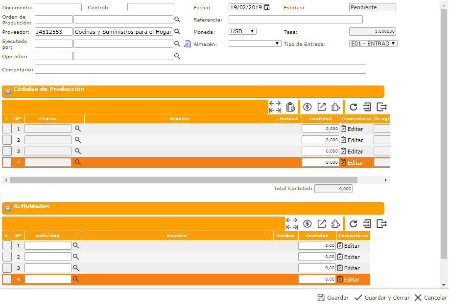 se muestra la ficha de Órdenes de Producción donde procedemos a llenar los siguientes campos: