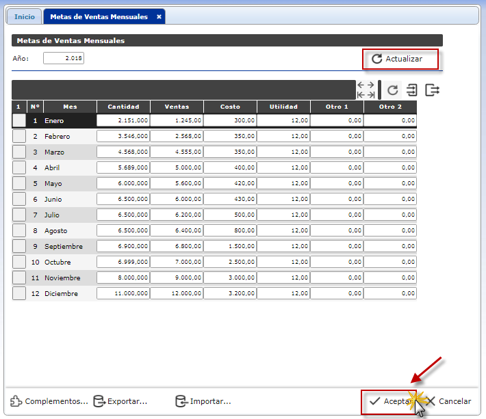 En este formulario puedes cargar las metas de ventas propuestas por mes, puedes seleccionar un año en específico y cargar los siguientes datos: cantidad mensual, ventas, costo, utilidad, otro 1, otro 2. También puedes importar o exportar las metas de un año en formato XML.