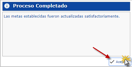 c. Después se muestra una ventana avisando que el proceso fue completado satisfactoriamente la Metas de Ventas Mensuales.